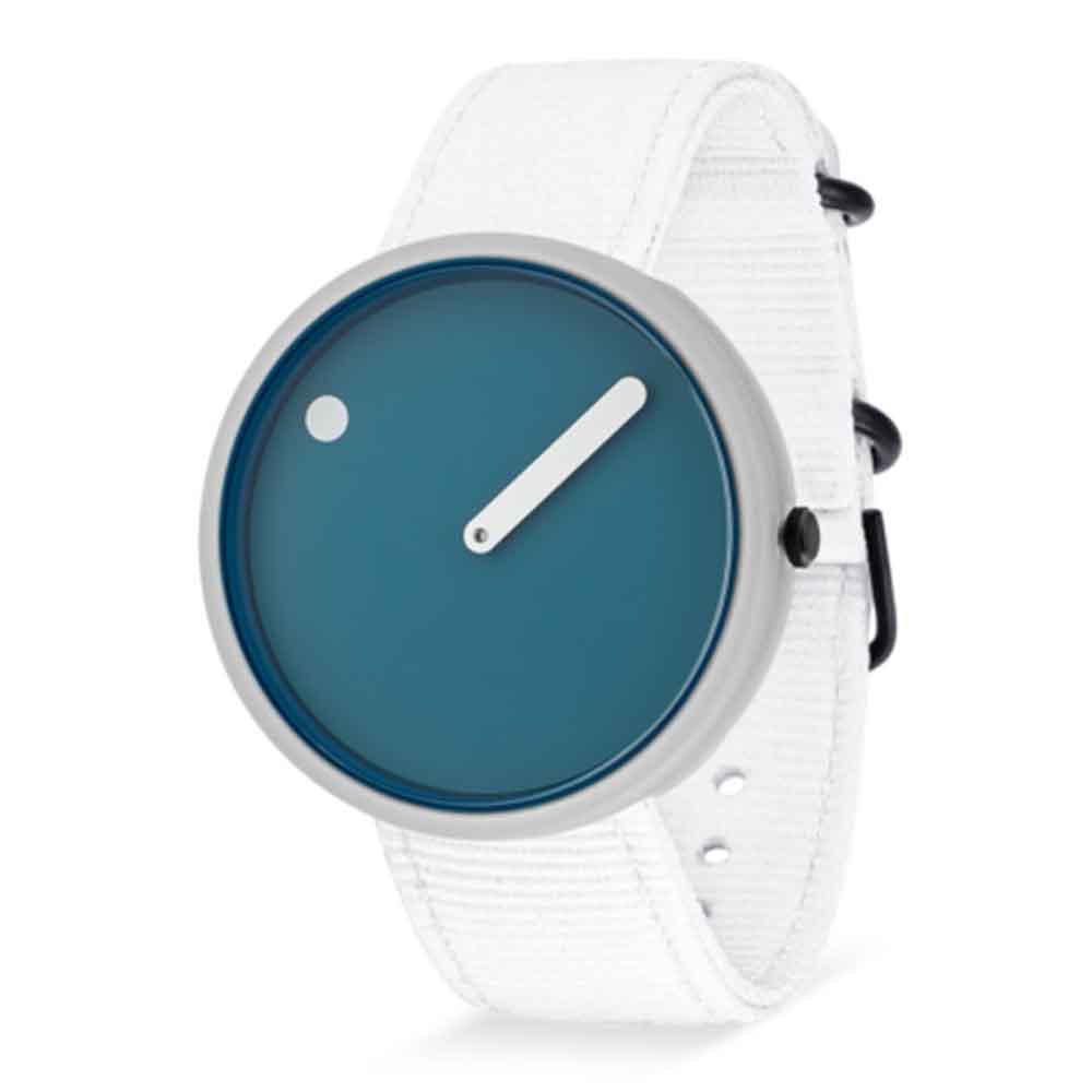 ساعت مچی یونیسکس پیکتو مدل PR44015-R014 با بند سفید و صفحه آبی ارائه میشود.
