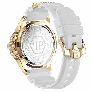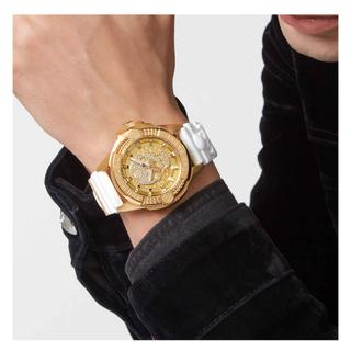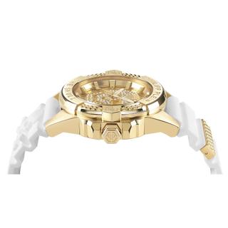 ساعت مچی مردانه Philipp Plein مدل PWAAA1221 با طراحی جسورانه و لوکس، انتخابی ویژه برای آقایانی است که در میان ساعت های مچی مردانه این برند بهدنبال اکسسوری با جلوه متمایز و پرسونای قوی هستند. قاب طلایی Ion‑Plated همراه صفحه طلایی با بافت ششضلعی و لوگوی جمجمه ۳D با کریستالهای تزئینی جلوهای چشمنواز ایجاد میکند و استفاده در استایل روزمره یا نیمهرسـمی را متفاوت و برجسته میسازد.