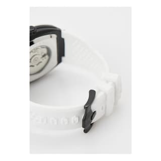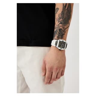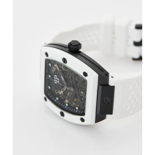 ساعت فیلیپ پلین PWBAA2424 از کالکشن The $keleton با طراحی قاب Tonneau (بشکهای) و ترکیب رنگ مشکی و سفید، ظاهری جسور و متفاوت دارد. قاب استیل ضدزنگ با شیشه مینرال مقاوم و بند رابر مشکی، هم حس استحکام میدهد و هم روی دست راحت است. صفحه اسکلتون با نماد جمجمه و استخوان، حرکت مکانیکی داخل ساعت را به نمایش میگذارد و پشت قاب شفاف هم این جزئیات را کاملتر میکند.