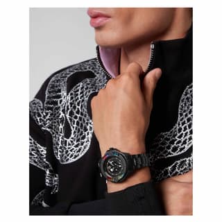 Philipp Plein مدل PWNAA0522 با طراحی شیک و جسورانه، گزینهای عالی برای آن دسته از کاربران است که میخواهند ساعتی متفاوت با پرسونای قوی به مچ ببندند. رنگ غالب این مدل مشکی مات با جزئیات رنگی زنده روی بزل و صفحه (به شکل کریستالهای رنگی) است که جلوهای مدرن و فراموشنشدنی ایجاد کرده و برای استفاده روزمره یا سبک خیابانی کاملاً مناسب به نظر میرسد.