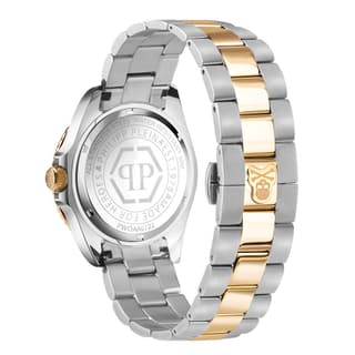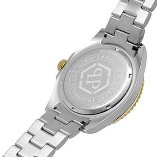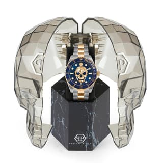 محصول مردانه Philipp Plein PWOAA0722 یک مدل پرطرفدار از سری کالکشن The Skull Diver است. قاب گرد ساعت مردانه اصل معرفی شده، طلایی رنگ و از جنس فولاد ضدزنگ به ابعاد 44 میلیمتر ساخته شده که برای همهٔ افراد مناسب است. زمینه صفحه سرمهای رنگ است و روی آن یک جمجمه اسکلت طلایی به شکل هندسی طراحی شده است.
