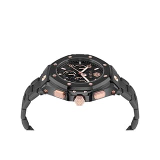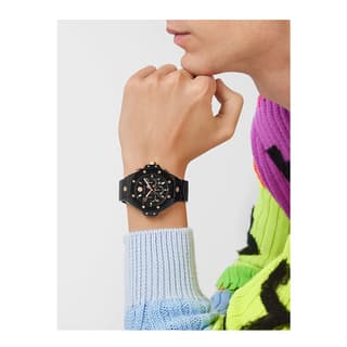 ساعت فیلیپ پلین PWPRA0424 با قاب استیل ۴۶ میلیمتری و طراحی شاخص صفحه، نمادی از جسارت و نگاه متفاوت این برند به دنیای ساعتسازی است. حضور پیچهای هگزاگونال روی قاب، ایندکسهای برجسته و لوگوی نمادین PP در موقعیت ساعت ۱۲ در کنار عقربه ثانیه با نشانه جمجمه، جلوهای خاص و چشمگیر به این مدل بخشیده و امضای منحصربهفرد فیلیپ پلین را تکمیل میکند. این ساعت از موتور کوارتز ژاپنی Seiko YM12A بهره میبرد که دقت بالا، نگهداری ساده و عملکرد مطمئن را تضمین میکند و با داشتن قابلیت کرونوگراف و نمایش تاریخ بین ساعتهای ۴ و ۵ کارایی آن برای استفاده روزمره کاملتر شده است. شیشهی مینرال سختشده مقاومت خوبی در برابر خط و خش ایجاد کرده و عقربهها و اندکسهای شبتاب نیز خوانایی در نور کم را تضمین میکنند. مقاومت در برابر آب تا عمق ۵۰ متر باعث میشود این ساعت برای استفاده روزمره، از شستوشوی دست گرفته تا قرار گرفتن زیر باران، انتخابی مطمئن باشد. بند سیلیکونی مشکی با سوراخهای هگزاگونال علاوه بر راحتی و سبکی، جلوهای اسپرت و مدرن به ساعت میبخشد و قفل سگکی آن اطمینان و ثبات بیشتری فراهم میآورد. در مجموع، Philipp Plein PWPRA0424 انتخابی است برای کسانی که میخواهند ترکیبی از استایل جسورانه، جزئیات منحصربهفرد و قابلیتهای کاربردی روزمره را در یک ساعت بادوام و شخصیتساز تجربه کنند.