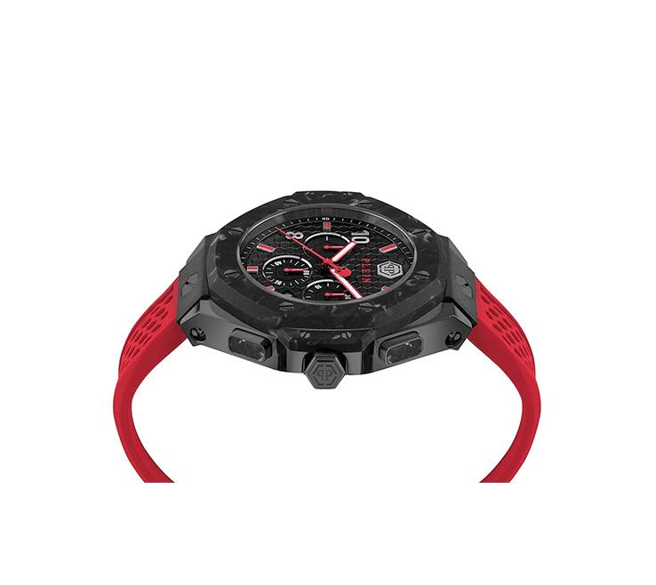 ساعت فیلیپ پلین PWPRA0724 با قاب استیل ۴۶ میلیمتری و طراحی شاخص صفحه، نمادی از جسارت و نگاه متفاوت این برند به دنیای ساعتسازی است. حضور پیچهای هگزاگونال روی قاب، ایندکسهای برجسته و لوگوی نمادین PP در موقعیت ساعت ۱۲ در کنار عقربه ثانیه با نشانه جمجمه، جلوهای خاص و چشمگیر به این مدل بخشیده و امضای منحصربهفرد فیلیپ پلین را تکمیل میکند. این ساعت از موتور کوارتز ژاپنی Seiko YM12A بهره میبرد که دقت بالا، نگهداری ساده و عملکرد مطمئن را تضمین میکند و با داشتن قابلیت کرونوگراف و نمایش تاریخ بین ساعتهای ۴ و ۵ کارایی آن برای استفاده روزمره کاملتر شده است. شیشهی مینرال سختشده مقاومت خوبی در برابر خط و خش ایجاد کرده و عقربهها و اندکسهای شبتاب نیز خوانایی در نور کم را تضمین میکنند. مقاومت در برابر آب تا عمق ۵۰ متر باعث میشود این ساعت برای استفاده روزمره، از شستوشوی دست گرفته تا قرار گرفتن زیر باران، انتخابی مطمئن باشد. بند سیلیکونی مشکی با سوراخهای هگزاگونال علاوه بر راحتی و سبکی، جلوهای اسپرت و مدرن به ساعت میبخشد و قفل سگکی آن اطمینان و ثبات بیشتری فراهم میآورد. در مجموع، Philipp Plein PWPRA0724 انتخابی است برای کسانی که میخواهند ترکیبی از استایل جسورانه، جزئیات منحصربهفرد و قابلیتهای کاربردی روزمره را در یک ساعت بادوام و شخصیتساز تجربه کنند.
