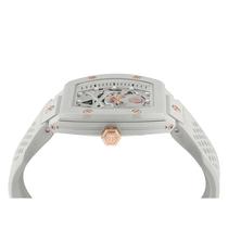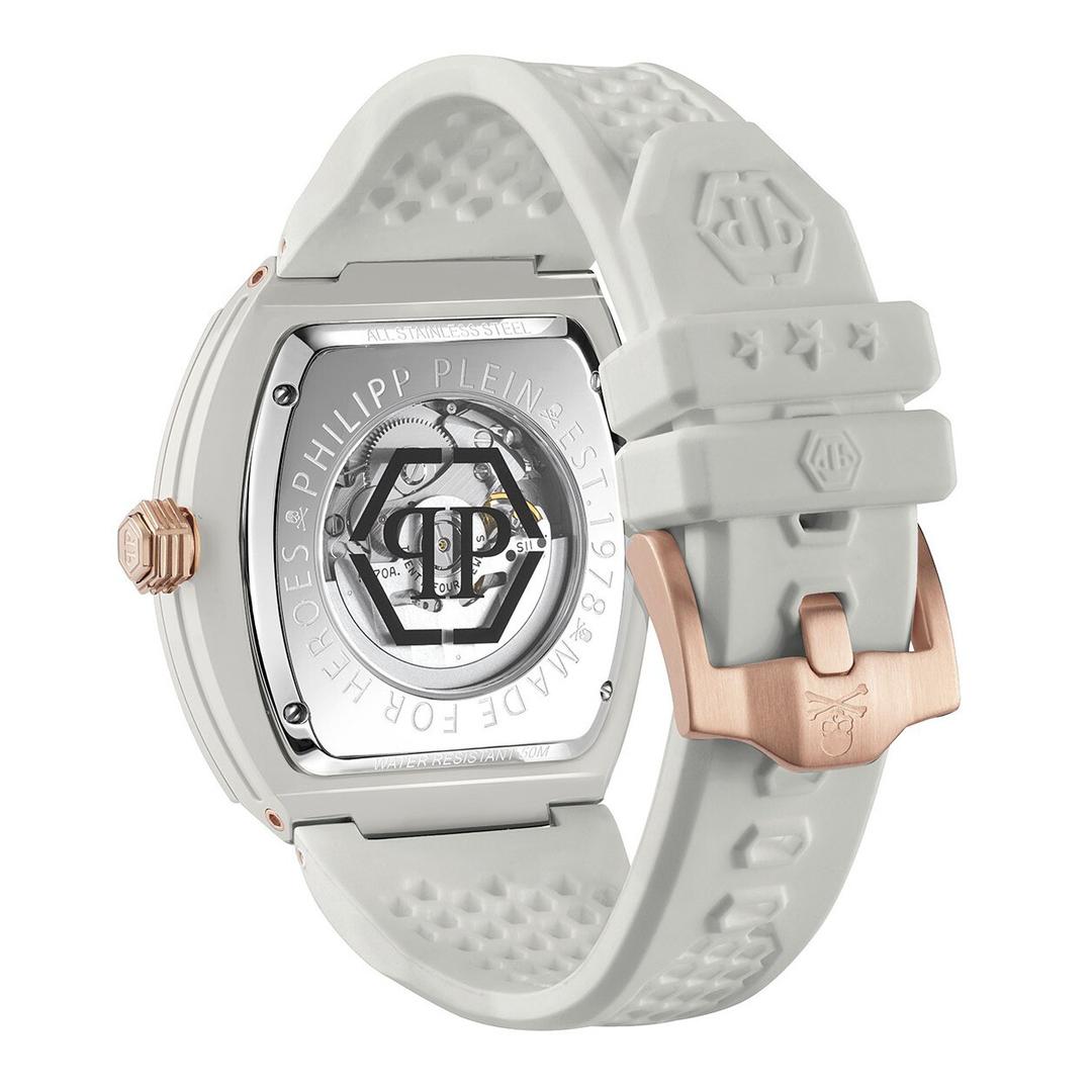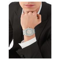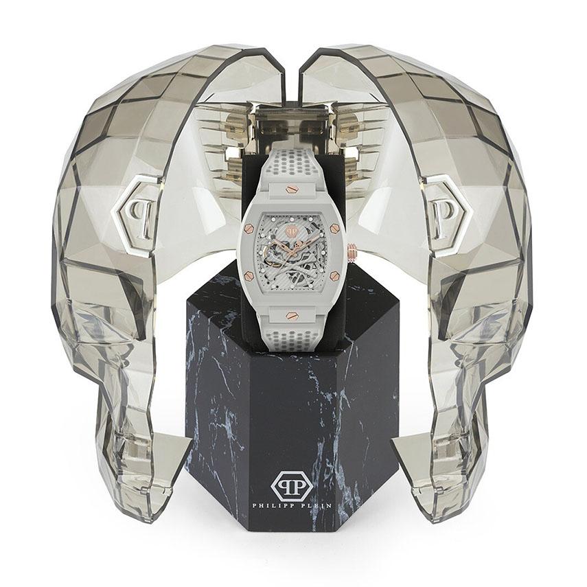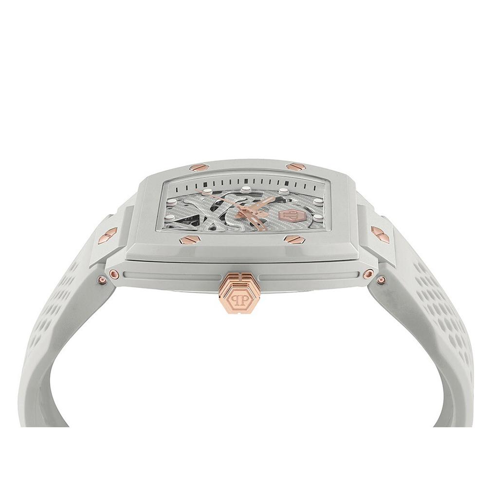 ساعت فیلیپ پلین PWVBA0123 از کالکشن The $keleton با طراحی قاب Tonneau (بشکهای) و رنگ سفید ، ظاهری جسور و متفاوت دارد. قاب استیل ضدزنگ با شیشه مینرال مقاوم و بند رابر سفید، هم حس استحکام میدهد و هم روی دست راحت است. صفحه اسکلتون با نماد جمجمه و استخوان، حرکت مکانیکی داخل ساعت را به نمایش میگذارد و پشت قاب شفاف هم این جزئیات را کاملتر میکند.
