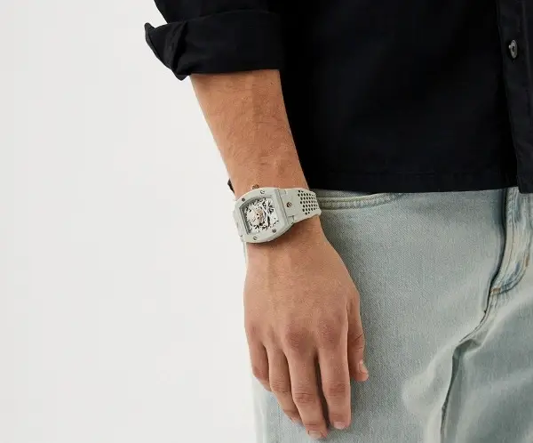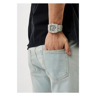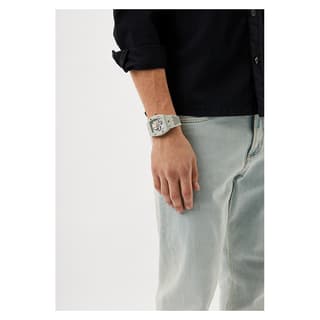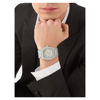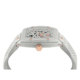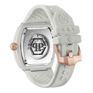 Philipp Plein مدل PWVBA0123 از کالکشن «The $keleton» با طراحی (Tonneau) و رنگبندی سفید عرضه شده است. قاب از استیل ضدزنگ ساخته شده و بند آن نیز از رابر سفید تشکیل میشود که ضمن احساس راحتی، ظاهری ماجراجویانه و چشمگیر دارد. صفحه اسکلتون با نماد جمجمه و استخوان، حرکت داخلی موتور را به نمایش میگذارد و پشت قاب شفاف، این نمای مهندسی را تکمیل میکند. ساعت معرفیشده گزینهای ویژه برای علاقهمندان به ساعت های مچی مردانه مهندسیشده و خاص میباشد.