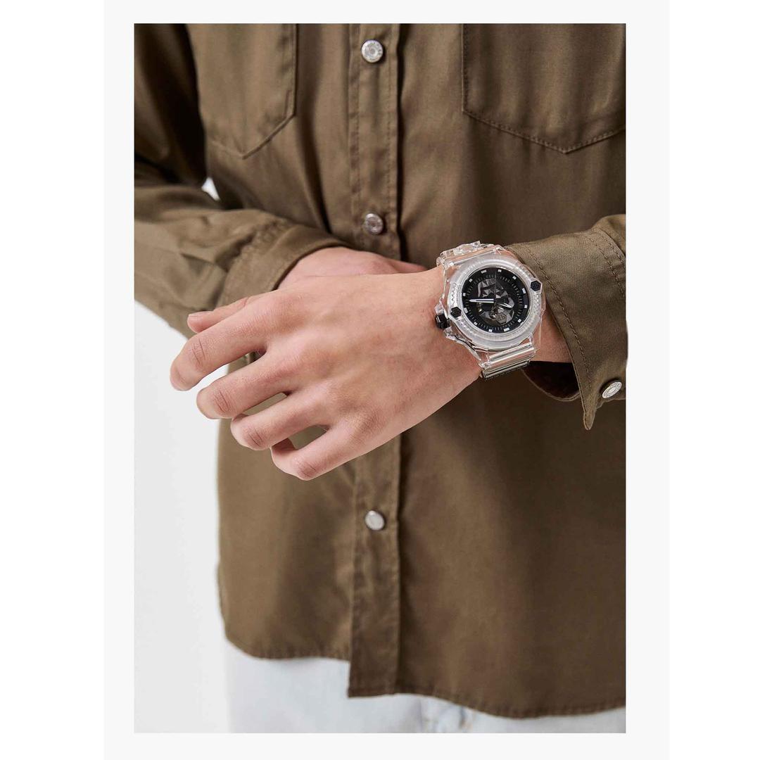 بند این مدل نیز از جنس سیلیکون بالا کیفیت بالاست. صفحه رؤیایی ساعت مچی philipp plein مردانه اصل، سفید است و با شیشه مینرال کریستال سخت در برابر آسیب و خراش محافظت شده، همچنین این صفحه بهگونهای طراحی شده است که خوانایی خوب را در شرایط نوری ضعیف تضمین میکند. این ساعت از مقاومت 5 ATM در برابر آب برخوردار است و برای شنا و شیرجه مناسب نیست.