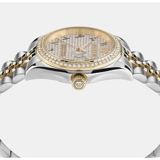 این محصول با طراحی فشن و مدرن، گزینۀ ایدهآل برای بانوانی است که به دنبال اکسسوری با ظاهری لوکس، برجسته و جذاب میگردند. ترکیب رنگ قاب و بند از استیل دو رنگ «نقرهای و طلایی» (two-tone stainless steel) جلوهای خیرهکننده ایجاد کرده و صفحه طلاییرنگ با شاخصهای عددی عربی و کریستالهای تزئینی، به ساعت نمایی چشمنواز بخشیده است. طراحی جذاب، رنگبندی هماهنگ و کیفیت ساخت بالا، ساعت فیلیپ پلین مدل PWYAA0823 را به انتخابی ممتاز برای استفاده روزمره، موقعیتهای خاص و هدیه دادن تبدیل کرده است.