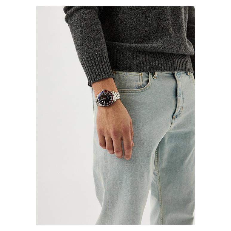 ویژگی متمایز این مدل عقربه چهارم GMT است که امکان مشاهده همزمان دو منطقه زمانی مختلف را فراهم میکند — ایدهآل برای مسافران، مدیران بینالمللی یا هر کسی که دوست دارد جهان را در مچ دستش داشته باشد. رینگ ۲۴ ساعته بیرونی و عقربه GMT رنگی، خوانایی و کارایی این قابلیت را افزایش دادهاند.