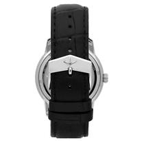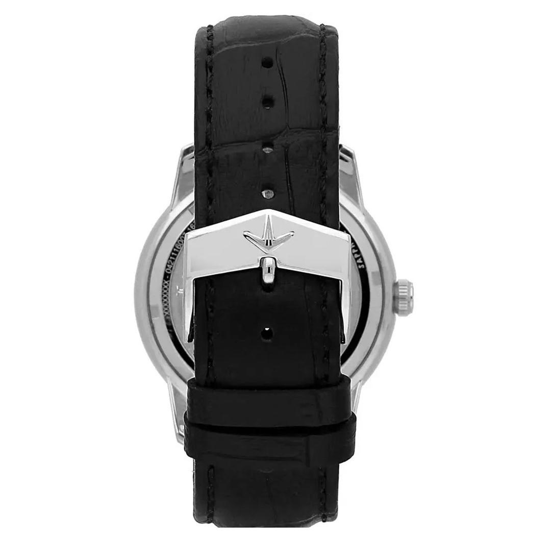 بند چرم مشکی با قفل پروانهای دکمهدار، راحتی و استحکام را در استفاده روزمره تضمین میکند. مقاومت در برابر آب تا ۳ اتمسفر (۳۰ متر)، امکان استفاده در شرایطی مانند شستوشوی دست یا باران سبک را فراهم میآورد.