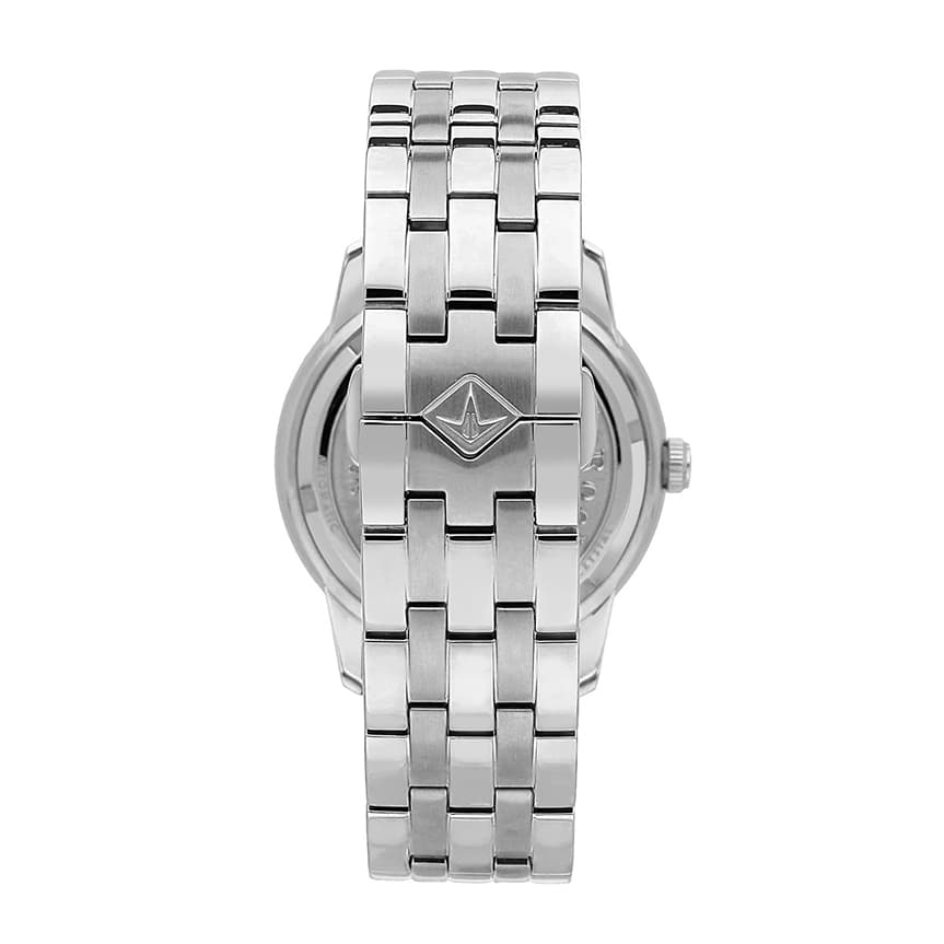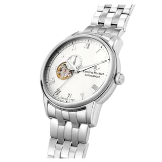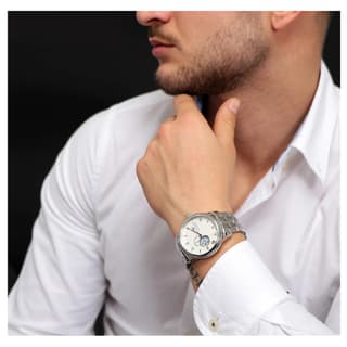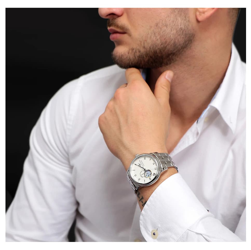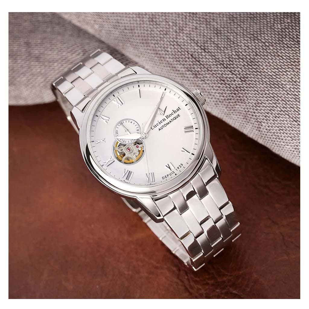 ساعت مردانه Lucien Rochat مدل R0423116001 با ظاهری کلاسیک و رسمی، ترکیبی از زیبایی و پیچیدگی فنی را به نمایش میگذارد. قاب نقرهای صیقلی و بند فلزی چندقطعهای، جلوهای شیک و مستحکم ایجاد کرده و صفحه سفید با اندکسهای رومی و open‑heart که حرکت دقیق مکانیکی موتور را نمایان میسازد، توجه هر بینندهای را جلب میکند. عقربهها و جزئیات طلایی روی صفحه، تضادی لطیف با زمینه سفید ایجاد کرده و جلوهای لوکس فراهم میکنند، در حالی که نمایشگر تاریخ در موقعیت عدد شش، کاربردی بودن این ساعت مردانه کلاسیک را افزایش میدهد.