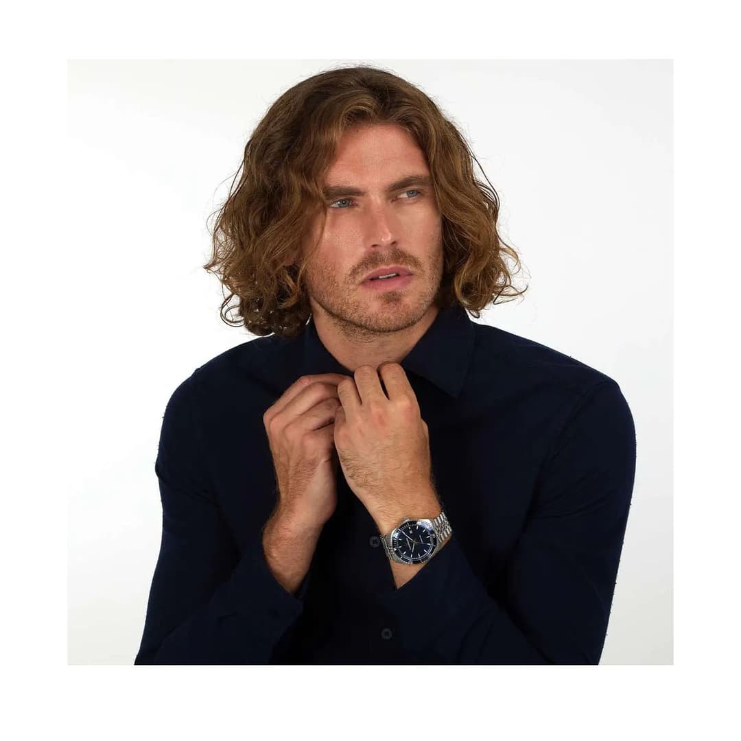 ساعت مردانه لوسین روشا مدل R0423117004 از مجموعه «Lèman»، ترکیبی از طراحی کلاسیک و جزئیات مدرن است که برای استفاده روزمره و موقعیتهای رسمی مناسب است. قاب استیل با پرداخت صیقلی و ساتن در ابعاد ۴۳ میلیمتر قطر و ۱۲٫۹ میلیمتر ضخامت، ظاهری متعادل و شیک بر مچ دست ایجاد میکند. صفحه آبی با طراحی مینیمالیستی و شیشه سافایر کریستال ضدخش، علاوه بر زیبایی، مقاومت بالایی در برابر خطوخش دارد.
