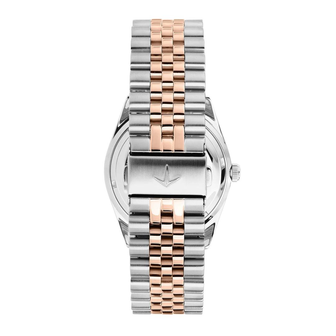 موتور اتوماتیک Miyota Cal. 8215 عملکردی دقیق و قابل اعتماد ارائه میدهد، بدون نیاز به باتری و با قابلیت نمایش ساعت، دقیقه و ثانیه، زمان را بهطور خودکار تنظیم میکند. بند استیل دو رنگ (نقرهای و رزگلد) با قفل پروانهای دکمهدار، راحتی و امنیت را در استفاده روزمره فراهم میکند. مقاومت در برابر آب تا فشار ۵ اتمسفر (۵۰ متر)، امکان استفاده در شرایطی مانند شستوشوی دست یا مواجهه با باران سبک را فراهم میکند.