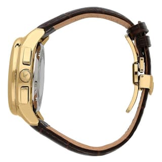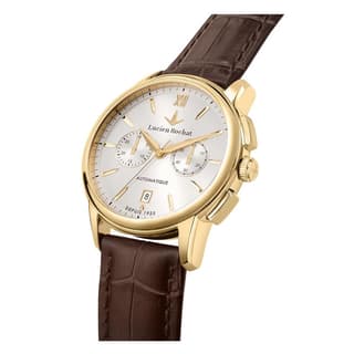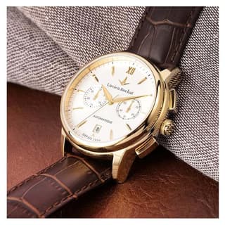 مدل R0441616001 از برند لویسن روشا با قاب طلایی روکش شده و بند چرمی قهوهای با نقش پوست کروکودیل، نمایی لوکس و کلاسیک دارد. صفحه سفید با دو زیرصفحه کرونوگراف، نشانگرهای طلاییرنگ و عقربههایی با همان رنگ، جلوهای برجسته ایجاد کردهاند. لوگوی برند زیر ساعت دوازده قرار گرفته و نمایشگر تاریخ در موقعیت شش، تعادل طراحی را حفظ نموده است. این ساعت جذاب مردانه برای افرادی که به استایل لوکس خود اهمیت میدهند فوقالعاده است.