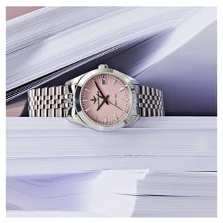 قاب ۳۲ میلیمتری استیل با پوشش صیقلی، جلوهای شیک و مقاوم در برابر خطوخش ایجاد کرده است. صفحه صورتی با طراحی ساده و شیشه معدنی، خوانایی بالا را تضمین میکند. موتور کوارتز MIYOTA GM12 دقت بالا و عملکردی مطمئن را فراهم میآورد. بند استیل یکپارچه با قفل پروانهای، راحتی و امنیت را در استفاده روزمره تضمین میکند.