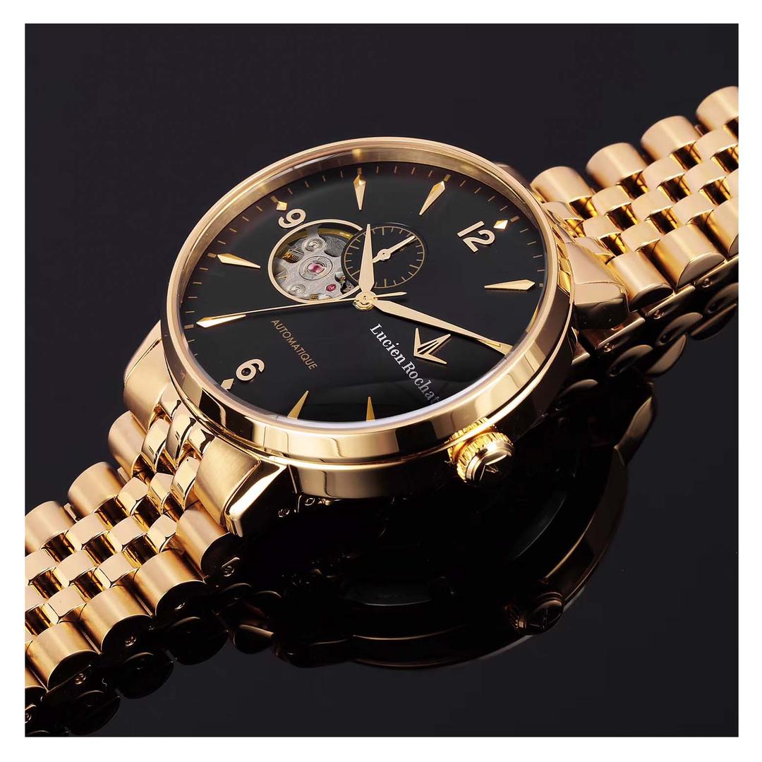 ساعت مردانه لوسین روشا مدل R0453120001 از مجموعه «Garçon»، ترکیبی از طراحی کلاسیک و جزئیات مدرن است. قاب ۴۱ میلیمتری استیل با پرداخت طلایی و شیشه یاقوت کبود (Sapphire) وضوح بالا و مقاومت در برابر خطوخش را فراهم میآورد.