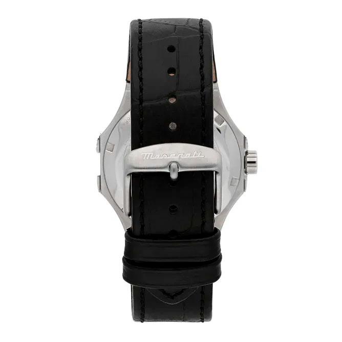 شیشه معدنی مقاوم از صفحه محافظت میکند. این مدل از موتور اتوماتیک دقیق بهره میبرد و بند چرمی مشکی رنگ با دوختهای همرنگ و قفل سگکی ساده، راحتی و امنیت را برای کاربر فراهم میآورد. مقاومت در برابر آب تا عمق 100 متر، این ساعت maserati را برای استفاده روزمره مناسب میسازد. طراحی اسپرت و در عین حال کلاسیک این مدل، آن را به انتخابی ایدهآل برای آقایانی که به جزئیات اهمیت میدهند تبدیل کرده است. لوگوی نیزه سهشاخه مازراتی نیز به ظرافت بر روی صفحه خودنمایی میکند.