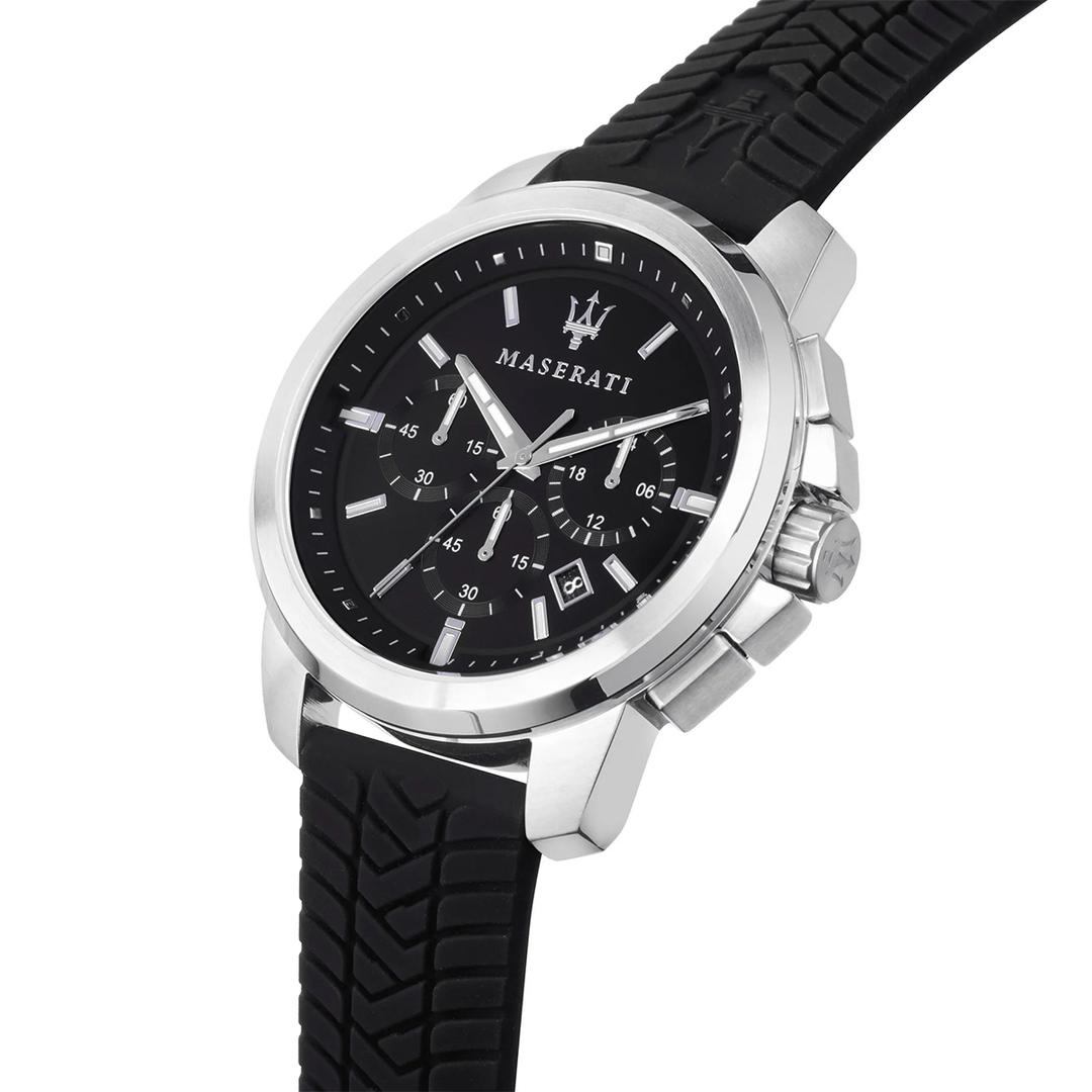 بند رابر مشکی و بدنه استیل ضدزنگ، علاوه بر ایجاد ظاهری جذاب و مقاوم، راحتی و دوام بالایی را برای استفاده روزمره و فعالیتهای ورزشی فراهم میکنند. شیشه معدنی با پوشش یاقوت، از صفحه ساعت maserati مدل R8871621014 در برابر خط و خش محافظت میکند و مقاومت در برابر آب تا 100 متر، امکان استفاده از آن را در شرایط مختلف آبوهوایی فراهم میسازد.