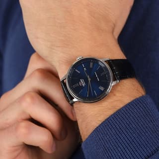 ساعت مچی اتوماتیک مردانه اورینت مدل RA-AC0J05L10B طراحی شده با بند چرمی مشکی و بدنه نقره ای از جنس استیل ضدزنگ و صفحه ی سرمه ای به قطر 42 میلی متر میباشد.
