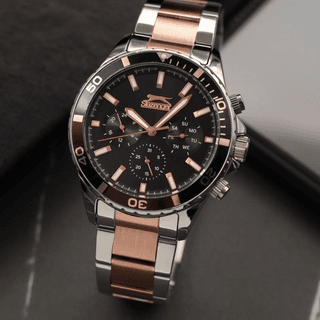 ساعت مچی مردانه اسلازنجر مدل SL.9.2065.2.04 با ترکیب بند نقره ای و رزگلد از جنس استیل ضدزنگ طراحی شده و با صفحه ی مشکی رنگ به قطر 45 میلی متر و نمایشگر تاریخ و روزهای هفته ارائه میشود. موومنت این ساعت کوارتز میباشد و تا عمق 50 متر در برابر آب مقاوم است.
