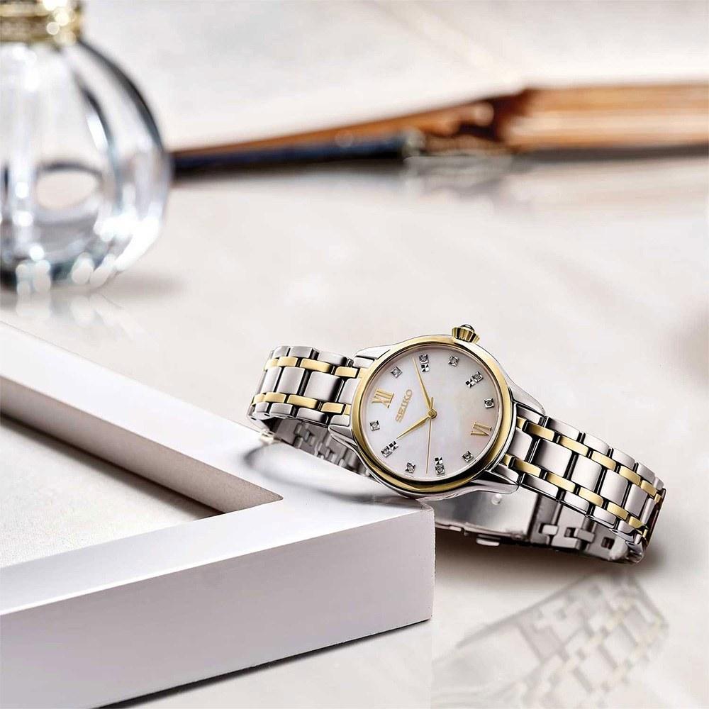 از کالکشن دایموند سیکو،با طراحی قاب ساده و دایره ای، این ساعت برای استفاده در مناسبت ها و به صورت روزمره طراحی شده است. صفحه ساعت دارای ایندکس های دایموند (دارای کارت ضمانت اصالت سنگ ها) در 12 نقطه از صفحه است.