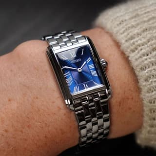 ساعت سیکو زنانه مدل SWR085P1، ظاهر شیک را با نوآوریهای فنی ترکیب میکند. صفحه آبیرنگ آن که با اعداد رومی تزیین شده است، سبکی زیبا و کلاسیک را ارائه میکند، درحالیکه دستبند فلزی، ظاهری مدرن ایجاد میکند. صفحه مستطیل 22.2 میلیمتری با شیشه هاردلکس گنبدی محافظت میشود.
