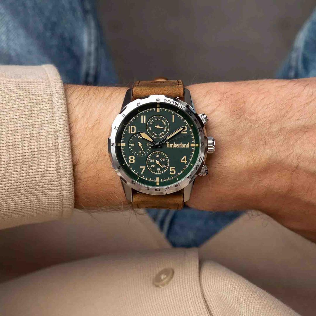 ساعت مچی مردانه تیمبرلند مدل TDWGF0055402 با ترکیبی از سبک شهری و قابلیتهای کاربردی یکی انتخاب هوشمند برای استفاده روزمره است. قاب 44 میلیمتری ساخته شده از فولاد ضدزنگ همراه با ضخامت حدود 11 میلیمتر، جلوهای مستحکم و در عین حال نهچندان حجیم ایجاد میکند. صفحهی سبز رنگ آن دارای نشانگرهای روز، تاریخ و زیرصفحهی 24 ساعته است؛ همهی اینها تحت پوشش شیشهی معدنی هستند.