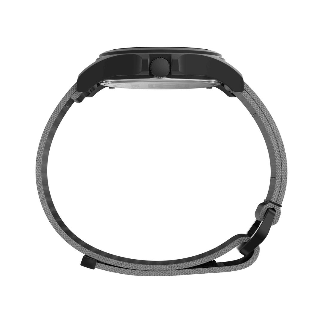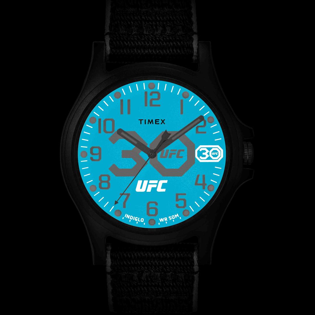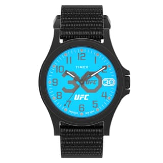 ساعت مچی مردانه تایمکس مدل TW2V90800 که با همکاری UFC تولید شده، دارای طراحی اسپرت و مقاوم با قاب و بند مشکی است. جنس قاب ساعت مردانه اورجینال معرفی شده از رزین مقاوم و جنس بند از ناتو چسبی است. صفحه مشکی 40 میلیمتری، با اعداد بزرگ و خوانا، نشانگرهای دقیقه و ثانیهشمار، و لوگوی UFC تزیین شده است.