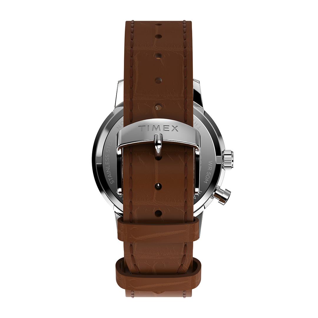 ساعت مچی مردانه تایمکس مدل TW2W51000 با قاب استیل ضدزنگ نقرهای و قطر 40 میلیمتر، دارای صفحه سبزرنگ با نمایشگر آنالوگ، موتور کوارتز و شیشه معدنی است. این ساعت بند چرم مردانه با بند قهوهای رنگ و قفل سگکی عرضه شده و از ویژگیهای نمایش وضعیت ماه در پایین صفحه، نمایش تاریخ توسط عقربه مرکزی، نمایش روز هفته در سمت چپ و نمایش ماه در سمت راست بهره میبرد.