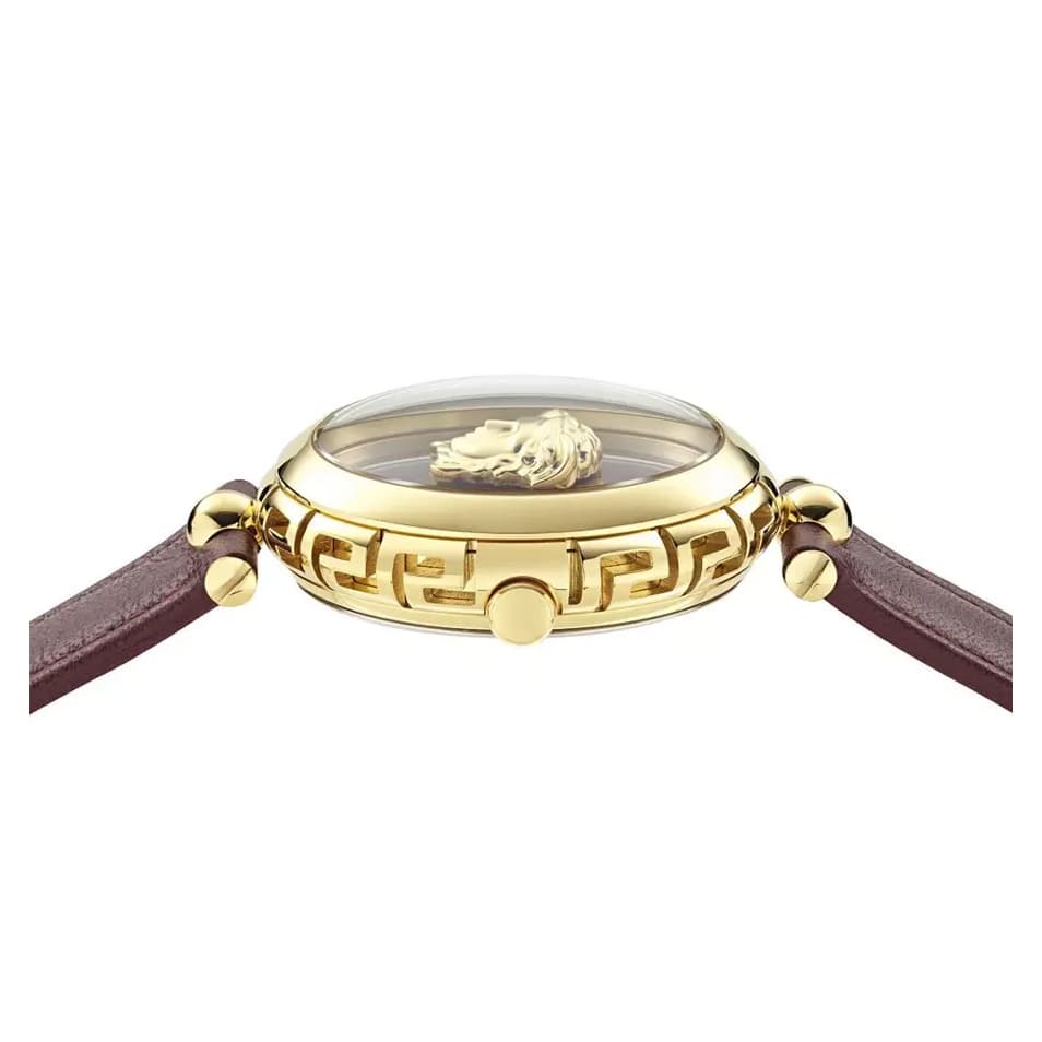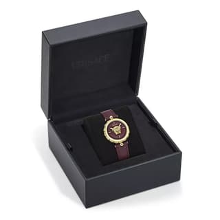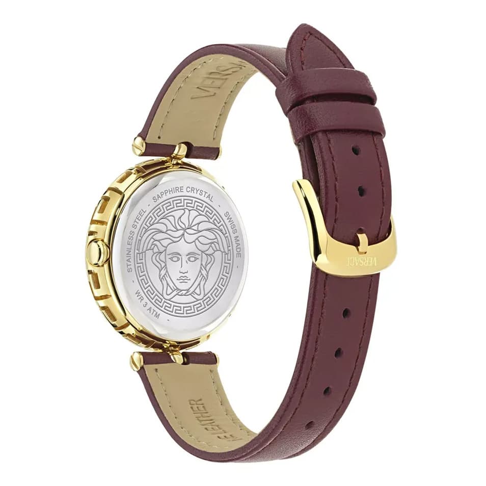 موتور کوارتز سوئیسی این ساعت دقت بالا، عملکرد بیصدا و نگهداری آسان را تضمین میکند، و آن را به گزینهای ایدهآل برای استفاده روزمره یا موقعیتهای رسمی تبدیل میکند. صفحه زرشکی با جزئیات طلایی و لوگوی نمادین مدوسا در موقعیت ۱۲ ساعت، ترکیبی از هنر طراحی و هویت برند ورساچه را به نمایش میگذارد و جلوهای لوکس و چشمگیر ایجاد میکند. شیشه یاقوت کبود (Sapphire) محافظ صفحه، مقاومت عالی در برابر خراش و وضوح دید در زوایای مختلف را تضمین میکند و شاخصها و جزئیات طلایی صفحه، خوانایی بالا و حس ساعتسازی حرفهای را منتقل میکنند.