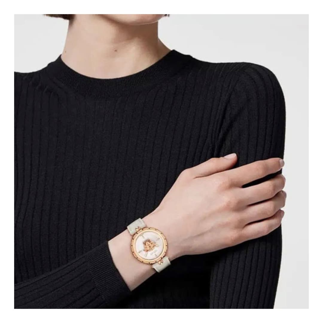 قاب این ساعت از استیل ضدزنگ با رنگ رزگلد/نقرهای ساخته شده و قطر ۳۴ میلیمتری آن ظاهری مناسب و متناسب با مچ بانوان ایجاد میکند، حس ظرافت و در عین حال قدرتمندی را با خود دارد. صفحهی سفید مرواریدی با جزئیات دقیق، هارمونی رنگی را با بدنه و بند چرمی سفید ایجاد کرده و جلوهای کلاسیک و درخشان ارائه میدهد که بهوضوح زبان بصری برند ورساچه را به نمایش میگذارد.