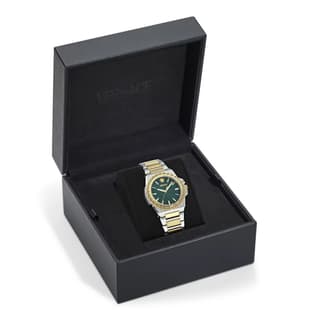 قاب این ساعت با قطر ۳۸ میلیمتر از استیل ضدزنگ دوگانه (بایکالر) ساخته شده و با صفحهی سبز گویلوشهکاریشده (green guilloché) ترکیبی چشمگیر و مدرن ایجاد میکند که بهوضوح هویت بصری ورساچه را منتقل میکند — طراحیای که حس ظرافت و وقار لوکس را بههمراه دارد.