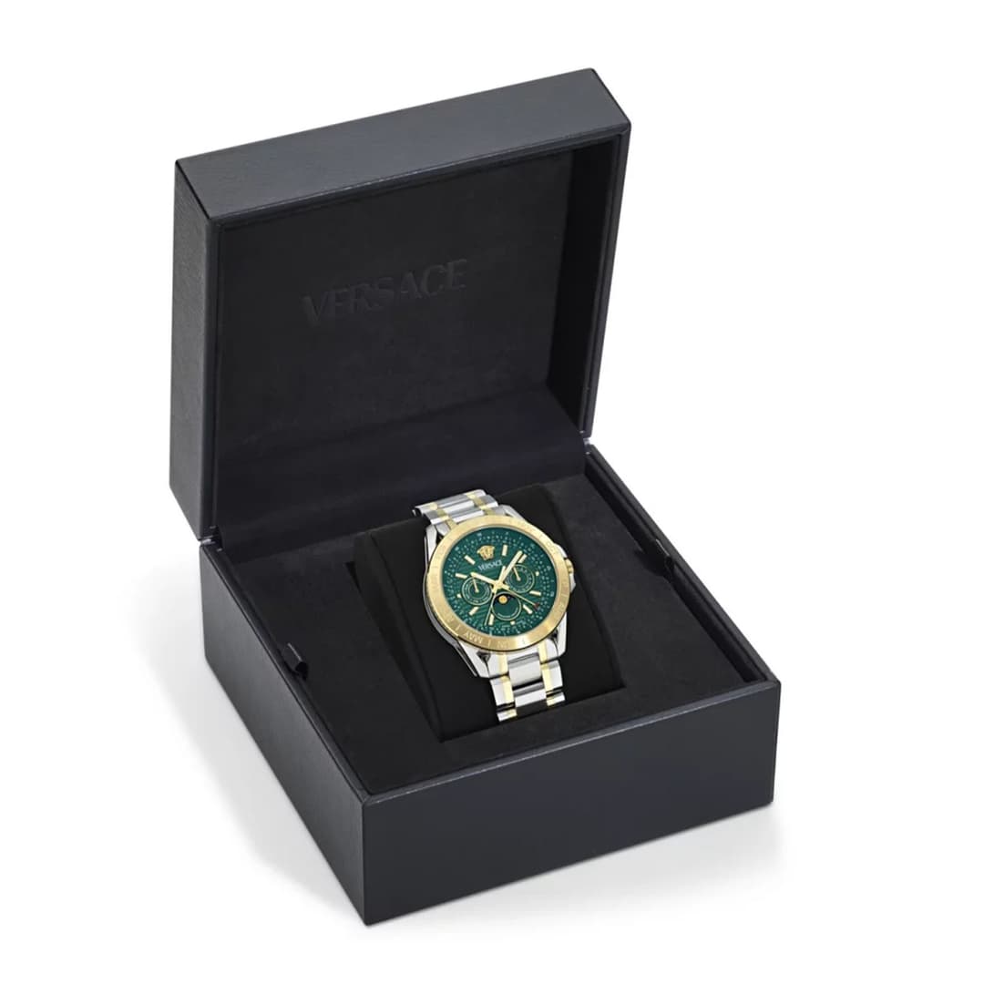 Versace V‑Galaxy Moonphase VE0K00325 یکی از برجستهترین ساعتهای لوکس مردانه از برند Versace است که طراحی ایتالیایی خاص را با امکانات پیشرفته و کیفیت ساخت سوئیسی در قالب یک قطعه بینظیر ارائه میدهد — مناسب برای آقایانی که به دنبال ترکیب کاربرد، سبک و لوکس بودن در یک ساعت هستند.