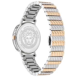 این مدل با قاب گرد حدود ۳۵ mm از استیل ضدزنگ دوگانه (bicolor) طراحی شده که تعادل بینقصی میان ظرافت و حضور چشمگیر روی مچ ایجاد میکند و آن را برای موقعیتهای رسمی، اجتماعی یا حتی استایل روزمرهی ستپسند مناسب میسازد. صفحهی سفید/نقرهای با لوگوی Medusa در ساعت ۱۲ جلوهای باشکوه و پرستیژمحور به ظاهر کلی ساعت میدهد، در حالی که الگوی Greca در حلقهی داخلی صفحه بافتی هنری و شناختهشده از ورساچه را منتقل میکند.