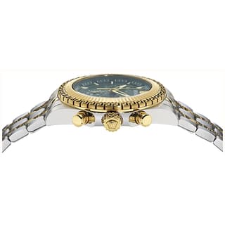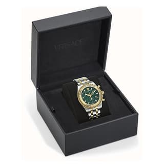 صفحهی سبز برجسته (Green dial) جلوهای منحصربهفرد و پرانرژی دارد و با سه زیرصفحه Chronograph و نمایش تاریخ در موقعیت ساعت ۴ ترکیب شده تا هم زیبایی بصری و هم کاربرد عملی را بهطور کامل ارائه دهد — طراحیای که ضمن ایجاد حس پویایی و حرفهای بودن، هویت بصری برند ورساچه را نیز بهروشنی منتقل میکند.