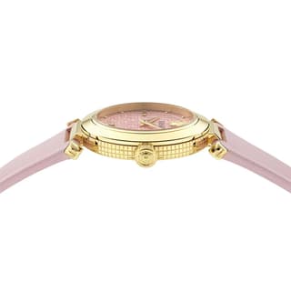 صفحهی صورتی لطیف (pink dial) طراحی بدیعی دارد که با لوگوی مشهور Medusa ورساچه در موقعیت ساعت ۱۲ ترکیب شده تا حس هویت برند و پرستیژ بصری را بهوضوح منتقل کند. این رنگ در کنار قاب طلایی جلوهای زنانه و لوکس به ساعت میبخشد که میتواند استایل شما را در موقعیتهای رسمی، اجتماعی یا روزمرهی شیک پشتیبانی کند.