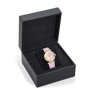 بند این ساعت از چرم گاوی صورتی (pink leather strap) ساخته شده که راحتی پوشیدن، حس لطافت و همخوانی کامل با رنگ صفحه و قاب را ایجاد میکند. قفل سگکی کلاسیک (buckle clasp) هم استفادهی روزمره را راحت و مطمئن میکند.