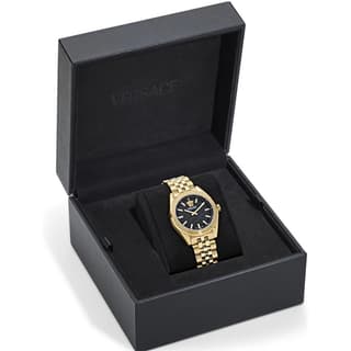 این مدل دارای قاب گرد ۳۶ mm از استیل ضدزنگ با پوشش طلایی (Gold‑PVD) است که تعادل بینقصی میان ظرافت زنانه و حضور قوی روی مچ ایجاد میکند، ابعادی استاندارد و خوشتعادل برای ساعتهای زنانهی لوکس. صفحهی مشکی با بافت دقیق Guilloché و خطوط Greca ظریف جلوهای ممتاز و عمیق به ساعت میدهد و لوگوی Medusa شناختهشده ورساچه در موقعیت ساعت ۱۲ هویت بصری برند را بدون تردید منتقل میکند.