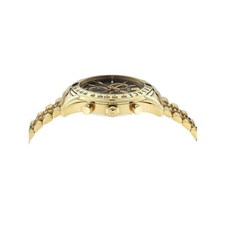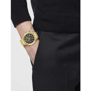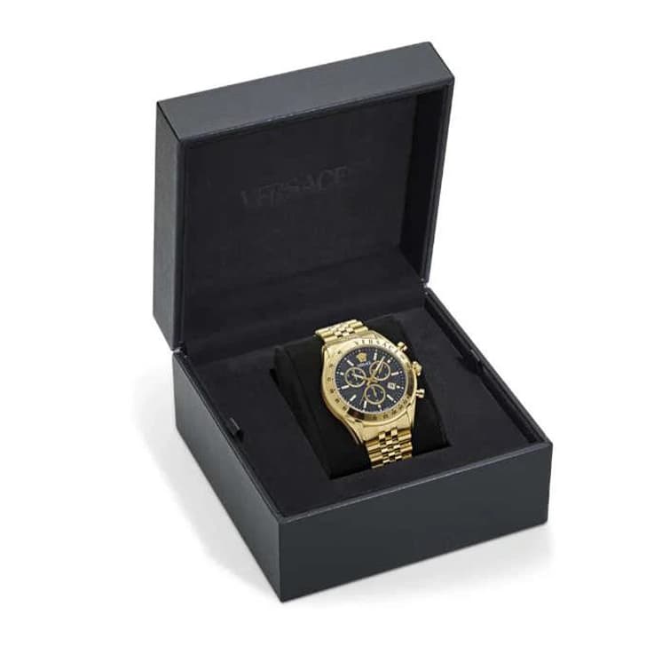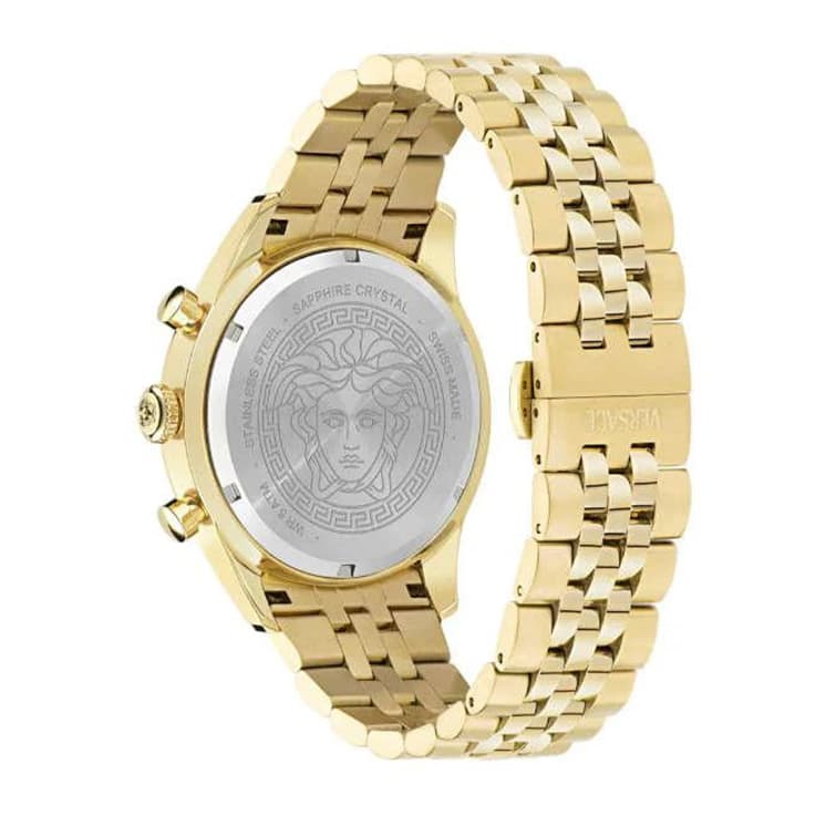 ظاهر VE8R00624 با قاب گرد ۴۴ mm از استیل ضدزنگ با پوشش طلایی (Gold Tone) طراحی شده که حضور قدرتمند و متوازن روی مچ ایجاد میکند — اندازهای استاندارد برای ساعتهای لوکس مردانه که در موقعیتهای رسمی، اجتماعی یا استفادهی روزمرهی ستپسند بهخوبی برجسته میشود. صفحهی این ساعت مشکی با بافت Guilloché و لوگوی Medusa است که هویت بصری برند را بهوضوح منتقل میکند و به طراحی عمق و شخصیت میبخشد.